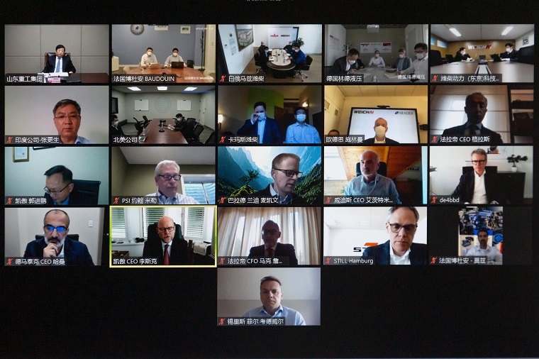 德國凱傲集團(tuán)、林德液壓、歐德思,意大利法拉帝,法國博杜安,英國錫里斯,奧地利威迪斯,美國德馬泰克、PSI,加拿大巴拉德,日本東京創(chuàng)新中心,印度公司,俄羅斯卡瑪斯合資公司,白俄羅斯馬茲合資公司等11個國家、14家企業(yè)的CEO匯報了所在國家和各自企業(yè)的情況,對濰柴總部提供的防疫物資支持表示衷心感謝。