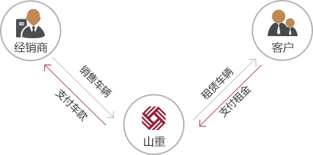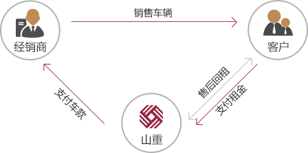 經(jīng)銷商向山重租賃推薦購車客戶,客戶與山重租賃操作售后回租;山重租賃向經(jīng)銷商支付車款,客戶按期向山重租賃償還租金。